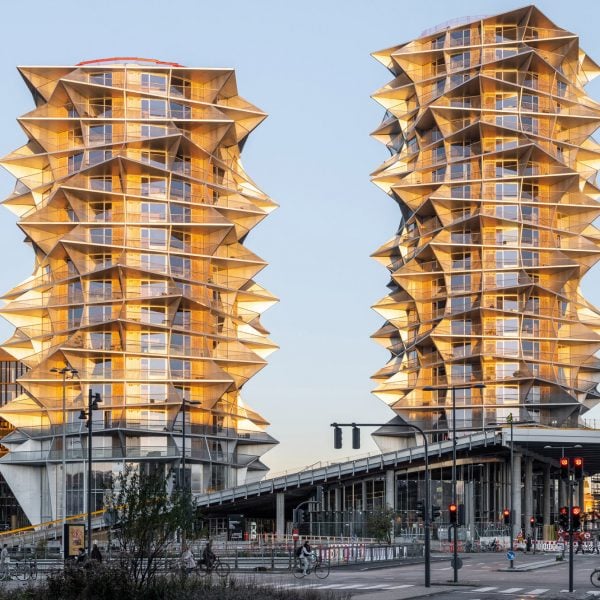 Las torres, conectadas por un parque elevado, contienen 495 apartamentos, algunos de los cuales se abren a balcones en las esquinas de la fachada irregular.