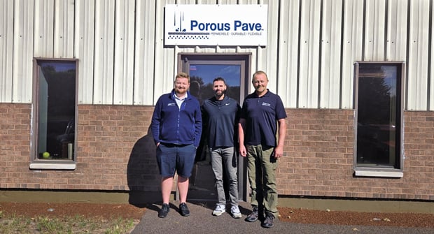 Servicio con una sonrisa: Kerry y Jill Cline, propietarios de C&S Lawn Service & Landscape en Wadsworth, Ohio, posan con el editor de LM Group, Bill Roddy (derecha), en la jornada de puertas abiertas y demostración de BEC en el Centro de servicio de North Canton de la empresa. (Foto: personal de LM)