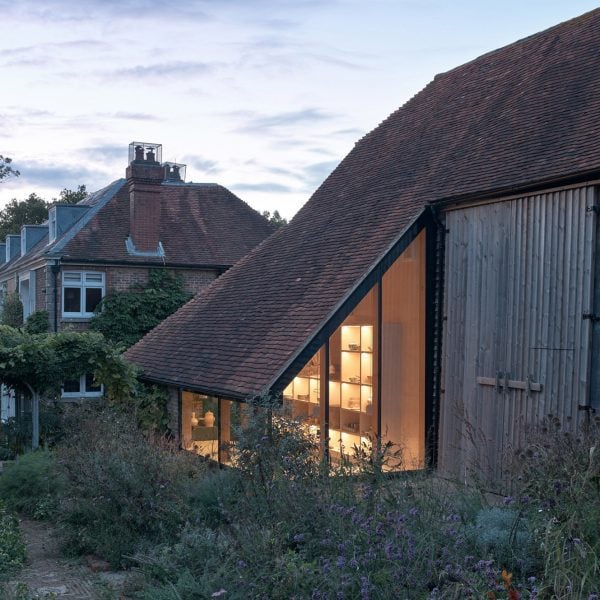 Ubicado en el pueblo de Framfield, en East Sussex, el estudio ocupa un almacén inclinado en ruinas contiguo a un granero de heno catalogado de Grado II, que data del siglo XV.