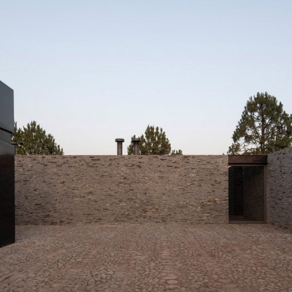 Conocida como Casa AV, la residencia de 1.200 metros cuadrados se extiende sobre un terreno inclinado en Tapalpa y consta de cuatro bloques rectangulares de una sola planta conectados por una serie de largos muros.