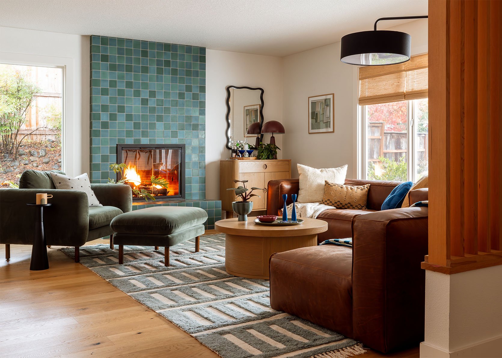Obviamente uno de los mayores cambios que hicimos fue revestir nuestra chimenea con este increíble azulejo. azulejos azules y verdes De Clé Azulejo. Sé (por experiencia de primera mano) que estas cosas son difíciles de activar, no son baratas ($1200 en mano de obra, $1000 en mosaico) y el miedo a que no le gusten los resultados puede ser alto. Pero todos estuvimos de acuerdo en que este mosaico sería perfecto y, he aquí, lo fue.