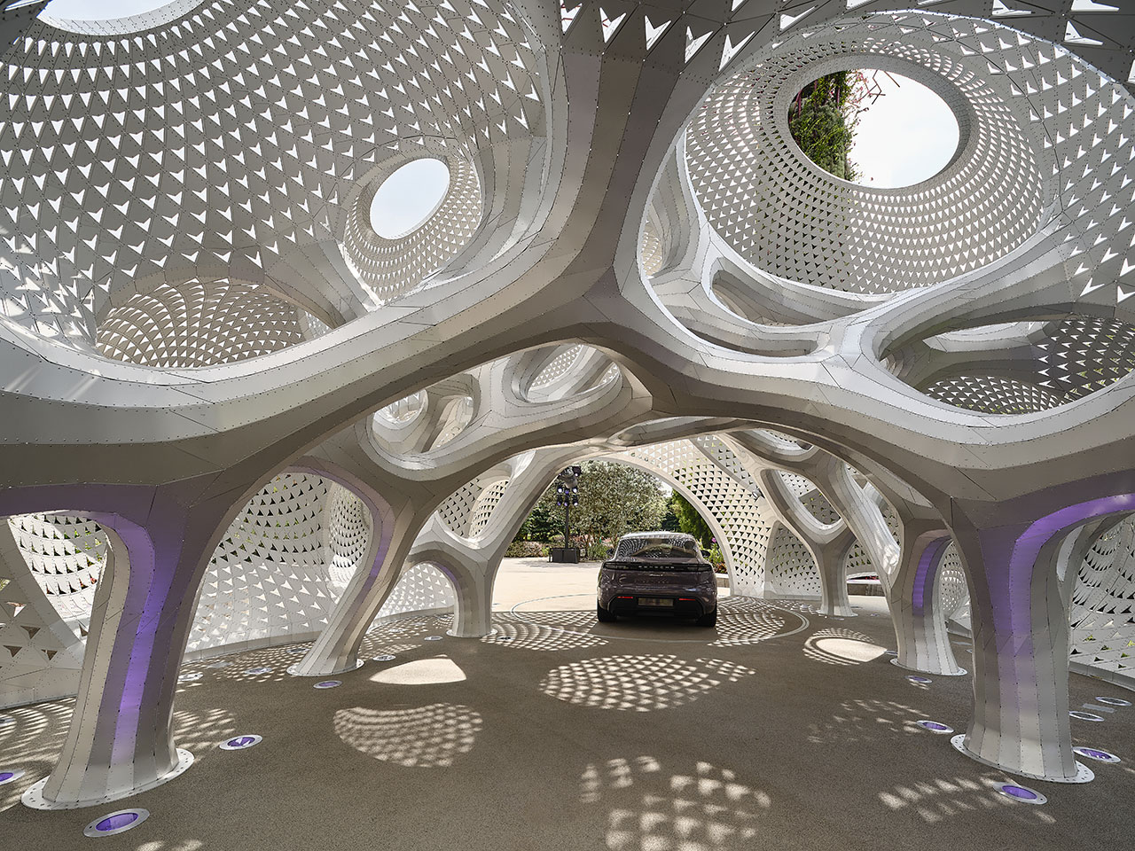 En una innovadora fusión de arte, diseño e ingeniería, los arquitectos Mark Fornes/THEVERYMANY y Porsche Creado mi garaje para dos autosun pabellón geométrico que celebra el debut del Porsche Macan totalmente eléctrico. Exhibida durante la Semana del Arte de Singapur, la estructura reúne principios de diseño de vanguardia y el espíritu compartido de rendimiento, precisión y excelencia estética de los colaboradores.