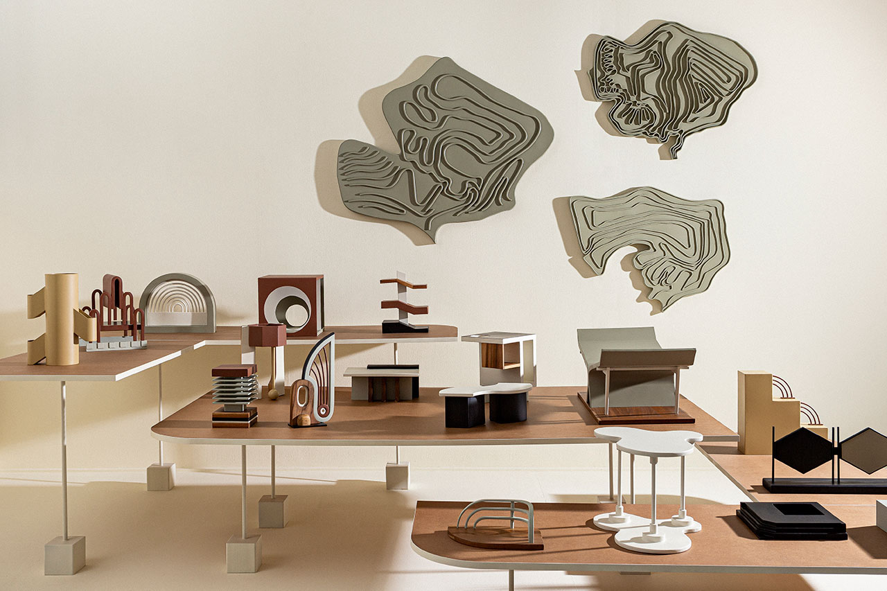 Exhibición de arte moderno con esculturas geométricas abstractas en tonos marrones, beige y grises dispuestas sobre superficies blancas y de madera.