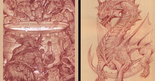 Estos incluyen: dragones, duendes, enanos, fantasmas y gárgolas. Hablando de medios, tenemos: Lápiz rojo sangre y blanco sobre papel de colores. Lápiz de grafito sobre papel blanco. Marcadores de tinta y escala de grises. Finalmente, pinta con una mezcla acrílica negra diluida.