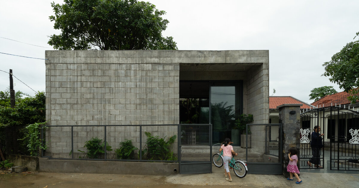 La fachada frontal de la casa de un solo piso consta de una pared de bloques de concreto sin terminar y puertas de vidrio empotradas, lo que brinda privacidad de la calle y mantiene el interior abierto. El vidrio introduce además líneas de visión verdes desde los espacios habitables hasta el jardín central. El equilibrio entre privacidad y conectividad es un tema recurrente, ya que la textura rugosa de las paredes de hormigón complementa la simplicidad de la vegetación circundante.