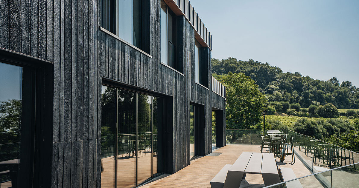 El poder y la belleza de este efecto se puede encontrar en una empresa llamada volcán En la ruta del vino de Gambellara, una región agrícola en las colinas volcánicas de Vicenza, Italia. Para reconocer la relación histórica y armoniosa con la tierra, los arquitectos Estudio ASALa empresa dirigida por Flavio Albanese buscaba un material de revestimiento exterior natural y sostenible que pudiera dialogar con las colinas de basalto y al mismo tiempo definir su propia dinámica y características modernas. Estaban interesados en la tecnología de sugiban manual, pero como proyecto hotelero, los requisitos de durabilidad, bajo mantenimiento y elegancia duradera para una experiencia de alta calidad para los visitantes eran clave.