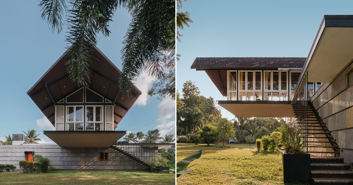 Voladizos de volumen inclinados sobre la casa de Thomas Parabir en Kerala