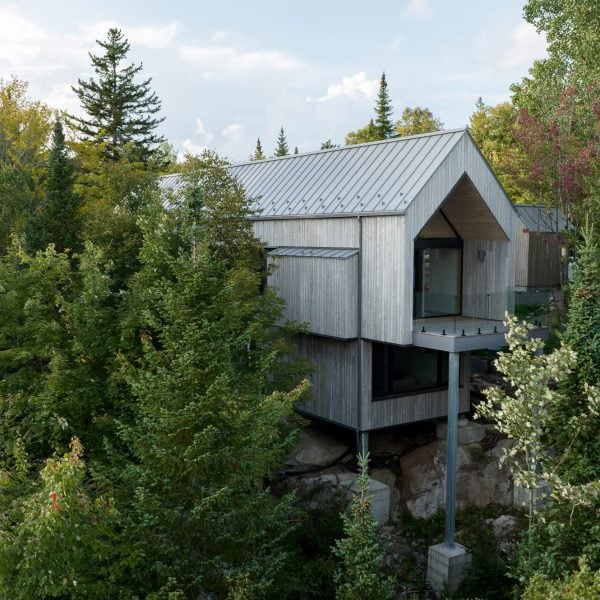 Esta casa de vacaciones fue construida para una familia joven y está situada en las Montañas Laurentianas, aproximadamente a 100 kilómetros al norte. Montreal. Se asienta en un terreno empinado y boscoso que se inclina hacia el lago de Nuestra Señora.