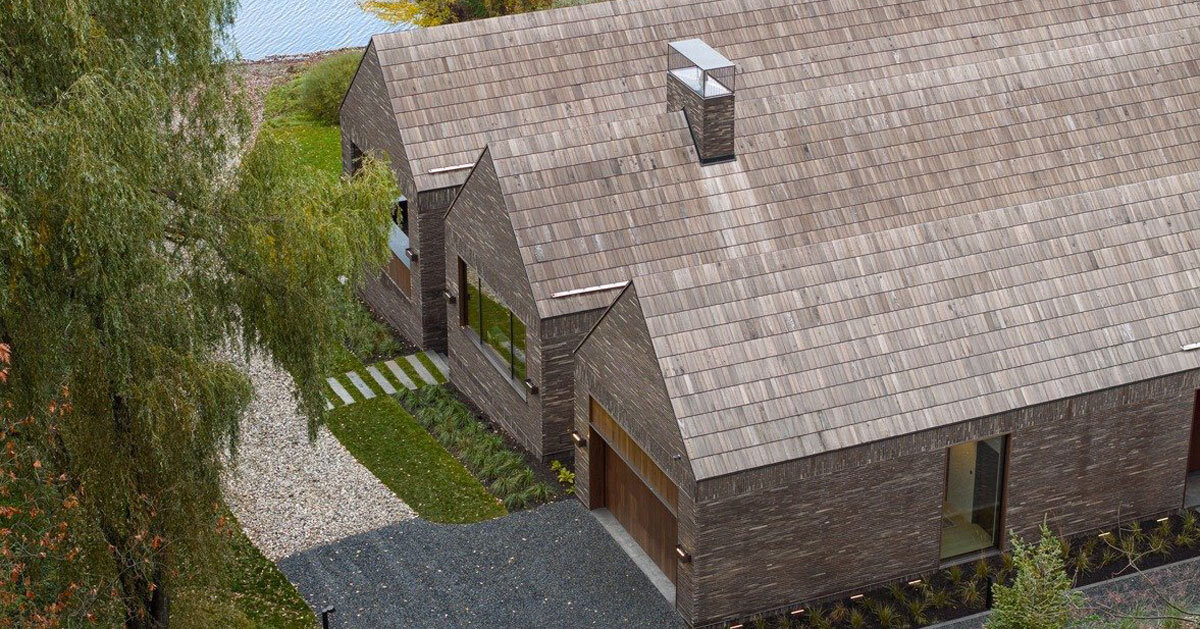 atelier échelle cubre la casa galería junto al lago con ladrillos de arcilla oscura, rindiendo homenaje a los graneros de Quebec