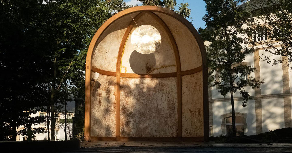 canción de origen, micelio-Residencia en Instalar Creado por Côme Di Meglio, explora la interconexión de la vida y el sonido en el jardín de esculturas de Champagne Maison Ruinart. Reims. La estructura combina materiales orgánicos y artesanía tradicional para convertirse en un espacio que fusiona dimensiones físicas y espirituales, sonido y materialidad, lo visible y lo invisible.