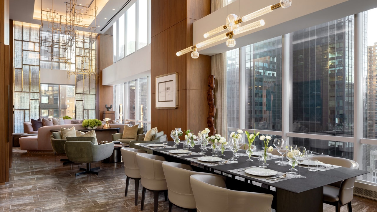 Al entrar, los huéspedes son recibidos por la sala de estar y el comedor iluminados por el sol, enmarcados por ventanas de piso a techo de 18 pies de altura que muestran vistas cinematográficas de la ciudad. Diseño de interiores por estudio de Nueva York. Corporación Sawyeres una oda a la sofisticación discreta y al minimalismo refinado. «[La suite]fue diseñada para ser una interpretación elevada de la vida residencial de Nueva York, que encarna la combinación natural de personalidad audaz y elegancia refinada de la ciudad», dijo Tracey Sawyer, fundadora y directora ejecutiva de Sawyer & Company. «Un guiño sutil a las líneas y texturas arquitectónicas del horizonte se combina con materiales ricos y táctiles y arte y diseño cuidadosamente seleccionados».