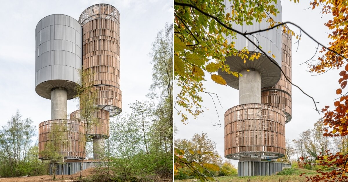 Situado dentro del bosque protegido Natura 2000 Luxemburgoarquitectura extrema’ agua Los embalses reconsideran la intersección de infraestructura y biodiversidad. Diseñado para albergar 1.000 metros cúbicos de agua potable, el edificio trasciende su propósito utilitario y se integra en su frágil entorno natural. Sus dos volúmenes distintos, de 50 metros de altura, fueron desarrollados según especificaciones técnicas precisas y trabajaron con un equipo de naturalistas y ornitólogos, complementando el equipo de diseño, para crear un refugio para la vida silvestre local y migratoria.