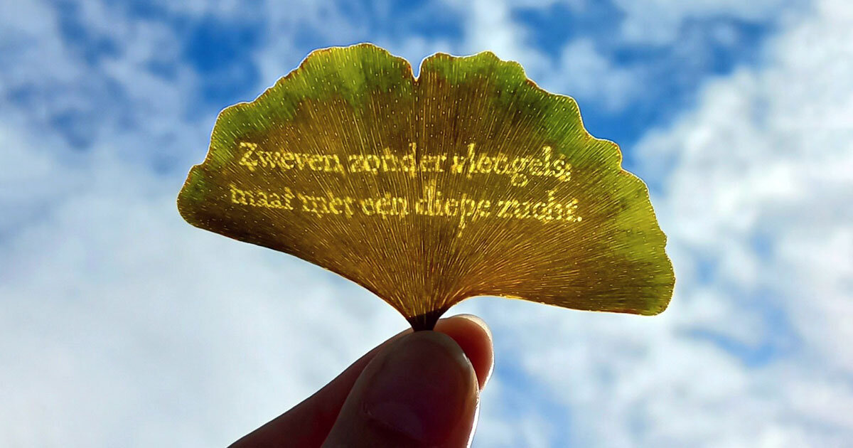 Herfstvlinders (o Autumn Butterflies) es un proyecto de la diseñadora Merel Slootheer que explora temas de fugacidad y dejarse llevar a través del uso innovador de materiales naturales. El proyecto convierte las hojas caídas en planta y los árboles se convierten en vehículos fugaces de expresión poética. pasar a través imprimir Al escribir pequeños poemas y pensamientos sobre estas hojas mediante la técnica del hematoma, el texto se vuelve temporalmente visible, integrado en el ciclo orgánico de la decadencia.