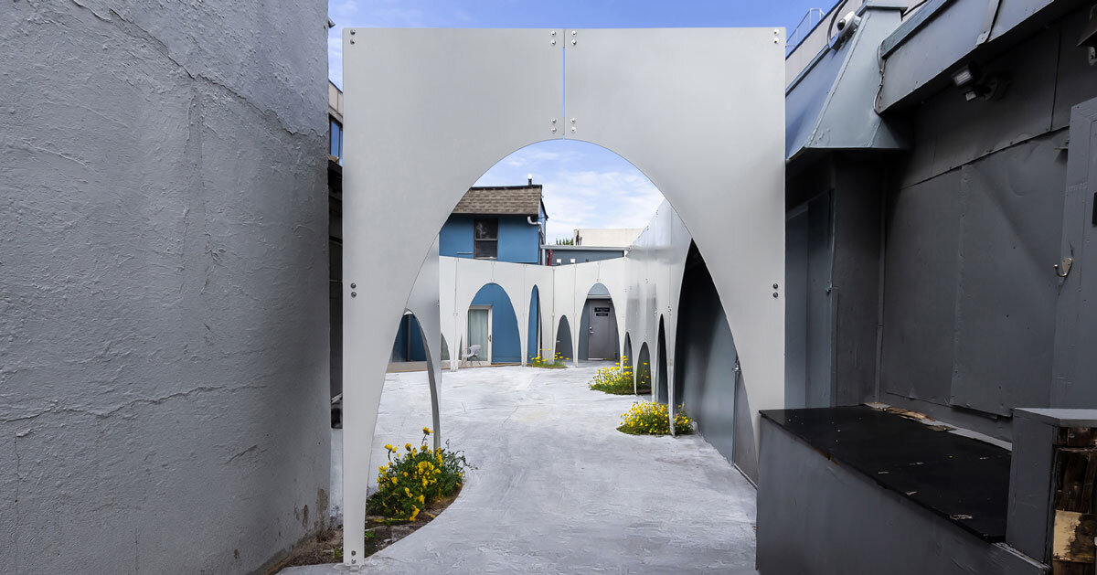 El diseño se centra en una serie de estructuras de acero con múltiples bóvedas hechas de placas de acero de 1/4 de pulgada. Dispuestos en diferentes ángulos, estos arcos crean un ritmo de espacios abiertos y cerrados, definiendo entradas privadas para los inquilinos al tiempo que promueven la luz natural y la privacidad. Ciertos arcos cuentan con parterres de flores, lo que permite la jardinería urbana y suaviza el contexto industrial con vegetación natural. Otros están adaptados para funciones técnicas, como soportar pantallas de proyección o proporcionar protección solar en la zona del bar, potenciando así la versatilidad del espacio.