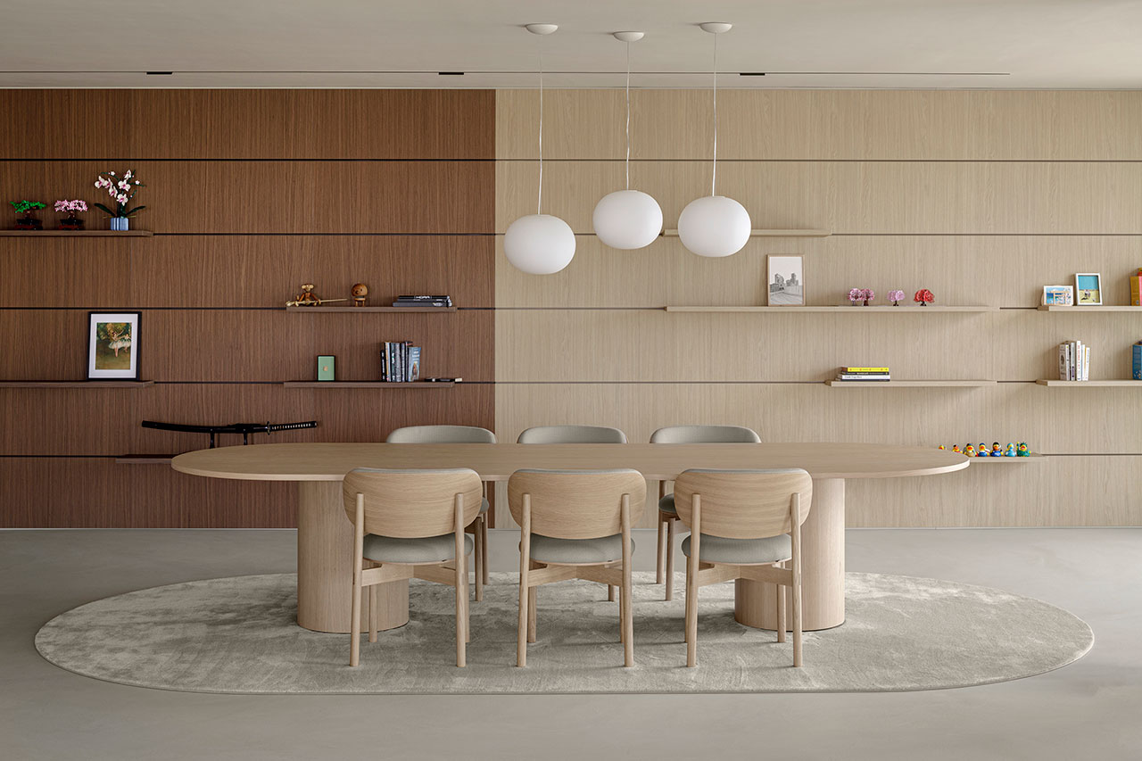 El pasillo de entrada principal recibe a los visitantes con tonos de madera oscura, lo que conduce a un espacio abierto contrastante lleno de tonos más claros. Un piano de cola negro se ve desde el principio flotando en el rincón del salón, lleno de ventanas. En todo el apartamento, muebles seleccionados de marcas como Arco, Hay y Dum añaden una sensación de confort moderno, mientras que los accesorios de iluminación de la marca italiana Flos ayudan a capturar la sutil interacción de luz, textura y diseño en el hogar.