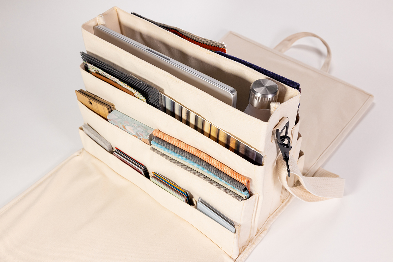 Como muchos proyectos de diseño, el nuestro comenzó y terminó no donde queríamos. Originalmente se me ocurrió una bandeja plegable que era más o menos un maletín. Investigué cómo se vería esta bandeja plegable y me di cuenta de que la bandeja terminó no teniendo el factor de forma correcto. Cuanto más lo pensamos, más encontramos la solución adecuada para el bolso. Las bolsas suelen ser muy ligeras. Si se construyen correctamente, puedes hacer algo bastante fuerte y relativamente barato. «Estas muestras son nítidas y es posible que tengas un fragmento de vidrio en tu chaqueta», dice la diseñadora de interiores Sandra Lévesque. «¿Por qué no agregamos algunas solapas para proteger el contenido y darle algo de rigidez?». Antes de que te des cuenta, lo hacemos. Hemos añadido solapas al modelo. También mencionó que todos los diseñadores del equipo de interiorismo trajeron manteles blancos. En una reunión con un cliente, habrá una mesa de madera o algún tipo de superficie oscura y querrás poder diseñar un lienzo en blanco para tus muestras. Esto finalmente nos llevó a diseñar la alfombra. Es una mercancía suave, liviana y ahora tienes un lienzo en blanco. Ese fue un momento ajá para nosotros. No soy el héroe aquí, una de mis cosas favoritas del tiro de dos puntos es la colaboración.