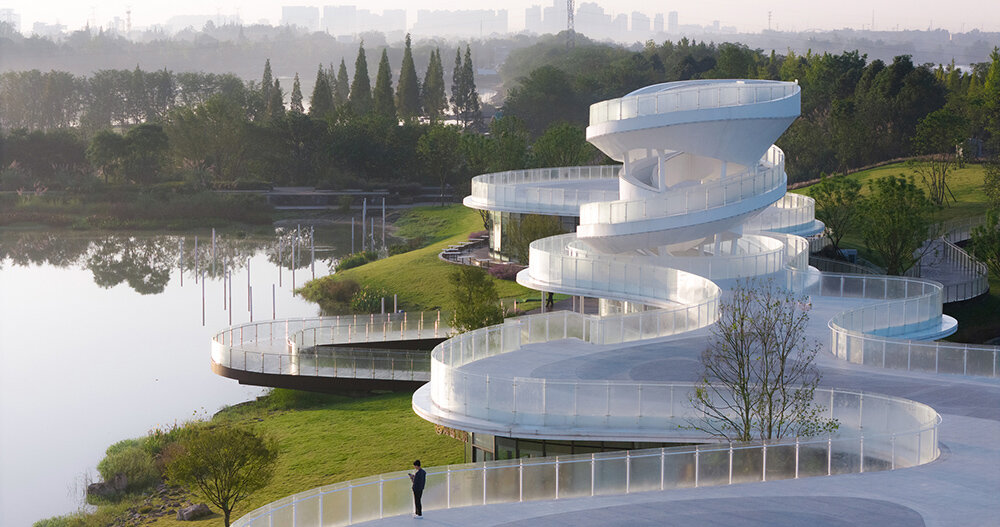 Muda Architects se basó en el prototipo de los pabellones de jardín chinos, y Lujiatan Wetland Park utiliza tecnología moderna para reinterpretar la relación entre techos y columnas. Las fluidas curvas de la estructura recuerdan las texturas de la orilla del río, mientras que un techo liviano revestido con paneles de metal blanco y fachadas de vidrio transparente crean la impresión de que el edificio está «flotando sobre el agua». El esquema se aleja del diseño tradicional y adopta un enfoque modular, reorganizando elementos espaciales en áreas interconectadas que fomentan la exploración. Los caminos optimizados mejoran la accesibilidad, conectan a los visitantes con el paisaje circundante y promueven la interacción activa con el sitio.