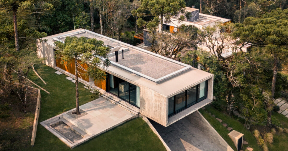 Ubicado en un apartamento rodeado de naturaleza. brasileño Altos House está ubicada en la ciudad de Canela y está diseñada para brindar una escapada de fin de semana a familias. Situado en una parcela con una topografía única, fue concebido por OSPA Arquitetura & Urbanismo como un puro volumen elemental en voladizo sobre el terreno inclinado. Desde esta posición elevada, los residentes también tienen vistas sin obstáculos del paisaje natural circundante mientras permanecen ocultos de la carretera. Para potenciar este diálogo visual, el estudio brasileño definió intencionalmente casas La paleta de materias primas incluye hormigón visto, cerramientos de cristal, suelos de madera y piedra natural.