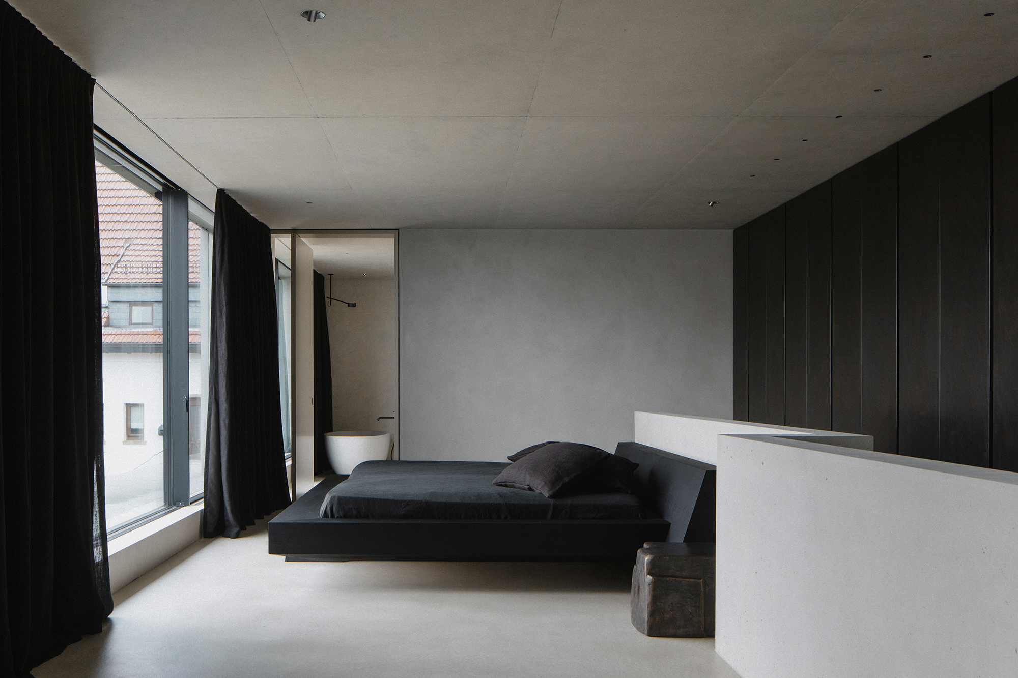 El dormitorio cuenta con una estructura de cama de roble quemado diseñada a medida y mesitas de noche de bronce macizo, con ventanales que dan al jardín. La fachada está definida por la interacción de materiales. Frente a la calle, la villa presenta una superficie opaca de listones de madera carbonizados y hormigón visto, proporcionando privacidad mientras se integra sutilmente con su entorno. Frente al jardín, el diseño se abre con ventanas panorámicas y puertas correderas, creando una transición suave entre el interior y el exterior.