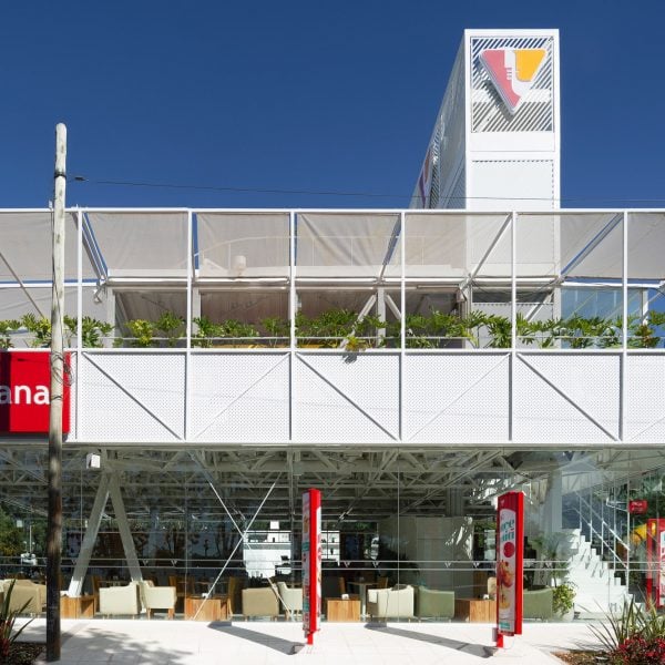 El estudio local DRM Arquitectura diseña un drive-thru enmarcado en el espacio heladería Colgando de una columna en forma de V invertida buenos aires,Argentina.