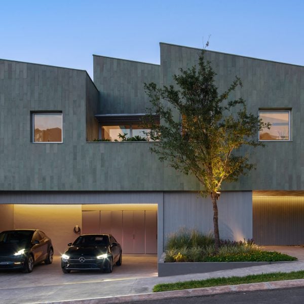 Una fuerte línea de referencia separa los dos niveles, y el nivel superior alberga áreas privadas para dormir, salones y oficinas envueltas en baldosas de concreto de color verde salvia fabricadas localmente que forman un pequeño plafón que sobresale hacia el exterior de la casa.