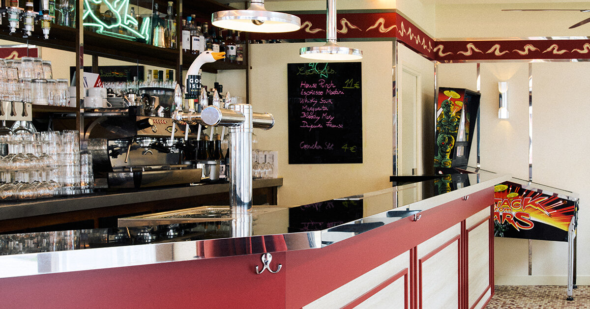 La barra es la característica central del espacio, combinando superficies con efecto de travertino laminado rojo mate con tapas con efecto de nogal negro brillante, un guiño al estilo de fórmica de principios del siglo XX. Un letrero de neón verde de pepinillos detrás de la barra agrega una referencia divertida al nombre del restaurante, que se traduce como pepinillo. El espacio incorpora auténticos elementos vintage, incluidas máquinas de pinball y estantes para postales, mientras que un friso de «humo» y murales en baños del pintor decorativo Mauro Ferreira añaden una sensación cinematográfica, inspirada en la película «Un air de famille» de Cédric Klapisch de 1996.