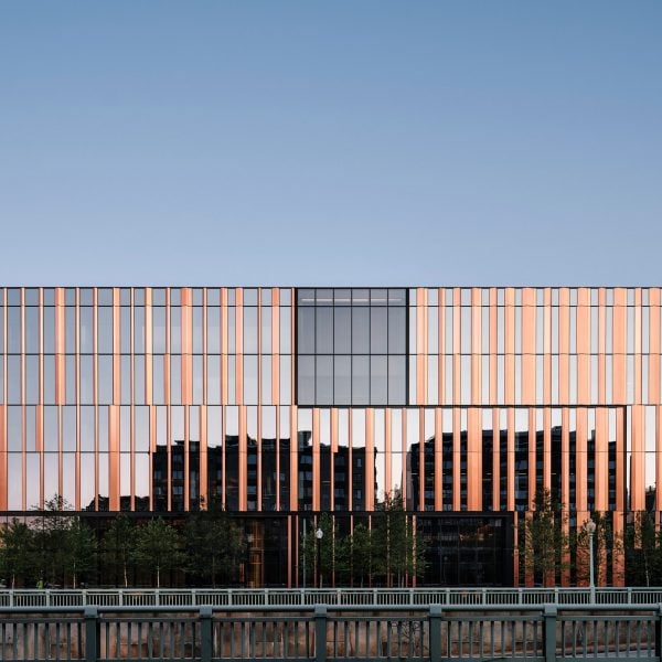 La forma rectangular, con su esquina suroeste biselada para acomodar la organización radial de la calle, está revestida con bandas verticales alternas de vidrio reflectante y cobre plegado, creando «diferentes grados de apertura».