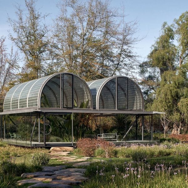 Ubicada en jardines privados, la Casa de Vidrio se completó a fines de 2018, pero fue capturada recientemente por un fotógrafo chileno. Cristóbal Palma Para mostrar la plenitud de las plantas tropicales del interior.