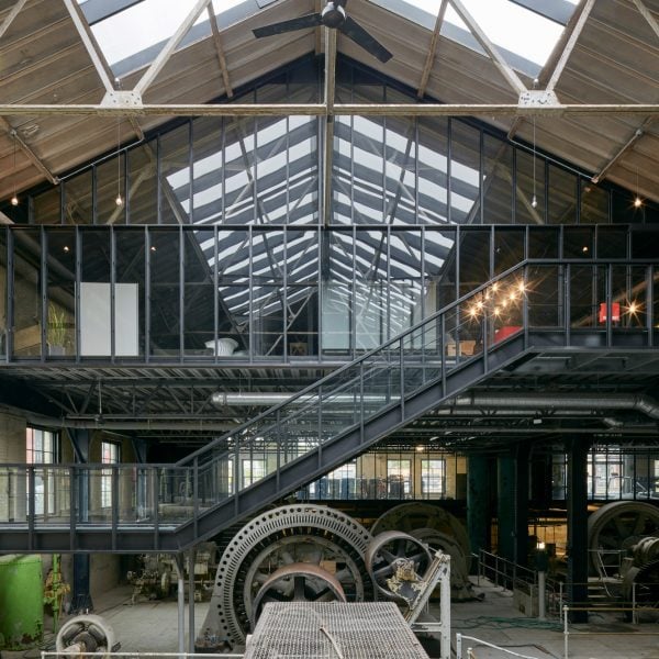 Para el edificio de ladrillo de la estación de bombeo, el estudio utilizó las capacidades de la estructura de la grúa pórtico para crear un «piso flotante» sobre la gran sala central, encima de la maquinaria original.