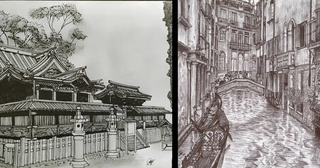 La pintura al agua es mi favorita. Imágenes de Venecia y pueblos chinos se encuentran a la orilla del agua, justo detrás de la ciudad italiana.