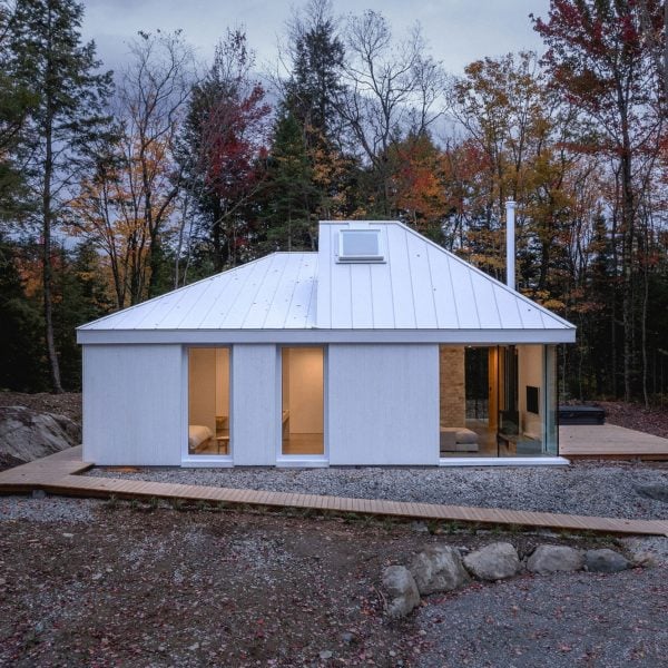 Paneles de madera blanca y paneles de techo metálicos del mismo color completan el exterior monocromático de Selenite, un refugio ubicado en el bosque. Quebeccompletado por Canadian Studio humanidades naturales.