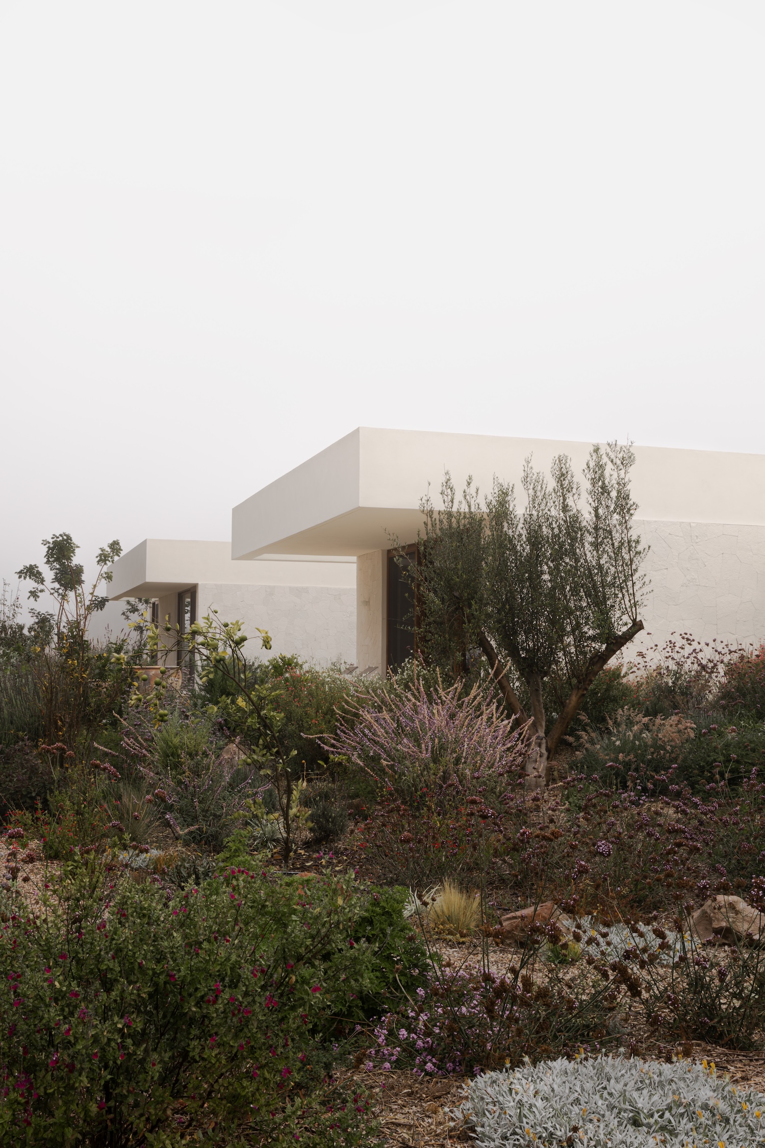 El perfil bajo y horizontal de la casa y el diseño exterior sobrio son intencionalmente discretos, lo que permite que el viñedo siga siendo el punto focal. El interior cálido y minimalista refleja la misma filosofía, sirviendo como un lienzo neutro que apoya el medio ambiente en lugar de competir con él. Los materiales de origen local refuerzan esta conexión con el lugar. La madera de mezquite, la piedra de Galarza, el estuco y el cuarzo se combinan con acabados de terrazo para arraigar la casa en su contexto regional. Los elementos fueron elegidos por sus tonos y texturas naturales, permitiendo que la estructura se fusione sin esfuerzo con el entorno.