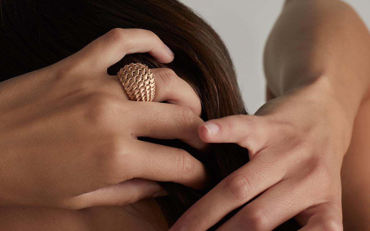 Los algoritmos digitales y el modelado 3D ayudan a la marca de joyería fina SIAN a diseñar elaboradas esculturas que forman anillos, pulseras y colgantes con delicadas rejillas. Estas delicadas formas entrelazadas se crean mediante impresión 3D para crear moldes de cera, que luego se utilizan en la producción. El SIAN suele ser una artesanía muy manual, pero amplía el abanico de técnicas en moda.