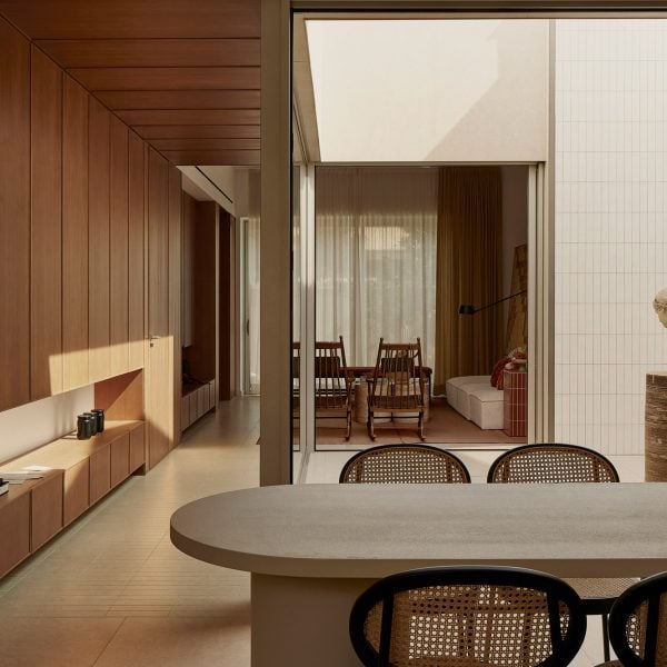 Una paleta de materiales minimalista crea una sensación cálida y neutra en todo el interior. Los azulejos de gran formato utilizados en los pisos complementan los tonos naturales de los gabinetes de roble teñido, mientras que la decoración interior introduce elementos más suaves al esquema.