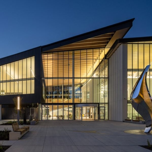 Exterior del centro acuático y comunitario təməsew̓txʷ, diseñado por HCMA