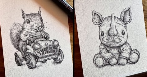 Después de esto, me gustaría traer a la ardilla en el coche y al niño disfrazado de rinoceronte. Continúe leyendo para ver más, todos dibujados con pequeños puntos de tinta.