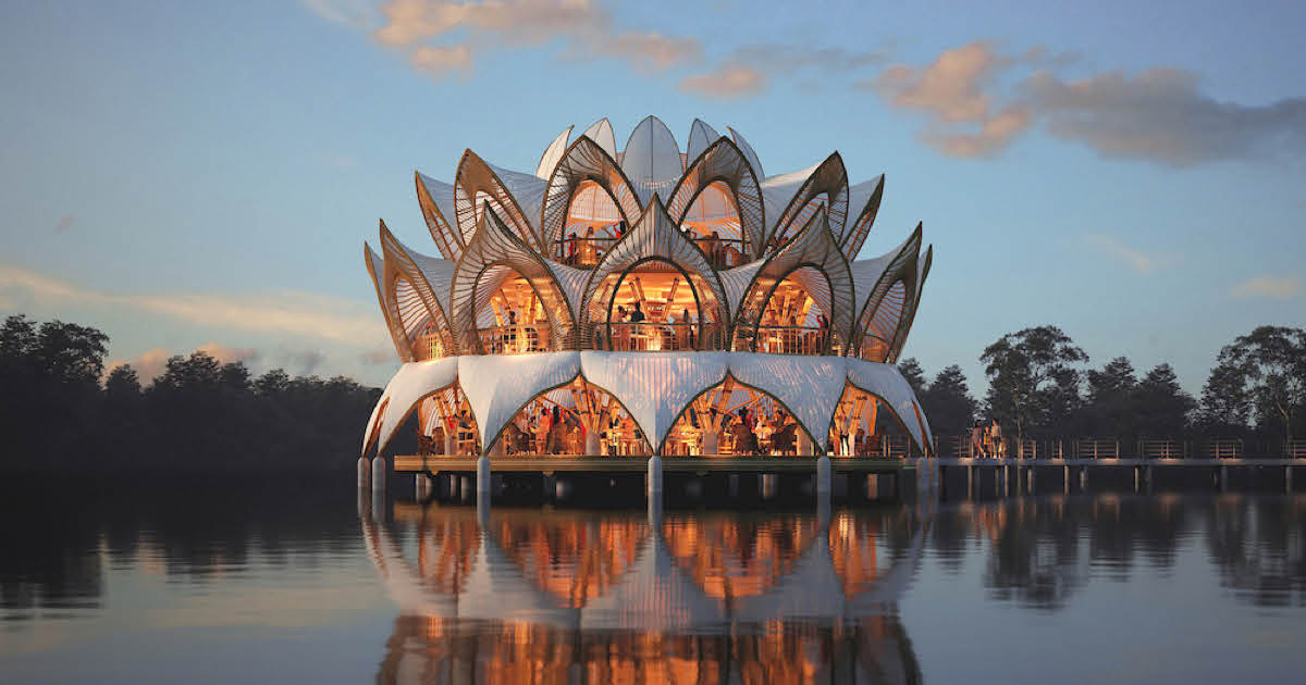 el restaurante en forma de loto flota silenciosamente sobre el agua