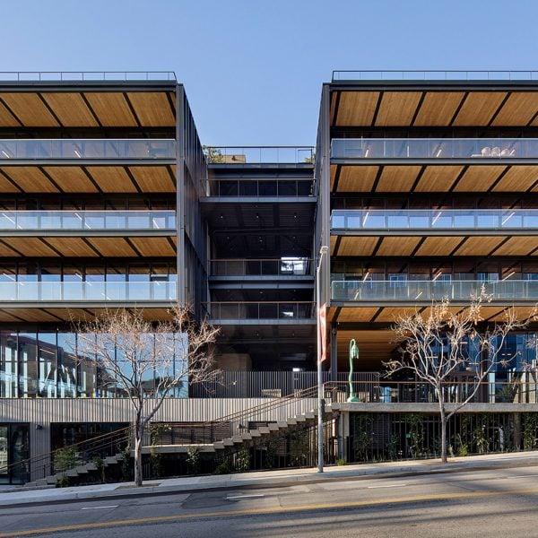 «Técnicamente, el proyecto es una renovación que toma un almacén minorista sin ventanas de la década de 1980 con un estacionamiento debajo e injerta una nueva estructura en la parte superior, creando el primer y más grande edificio híbrido de madera contralaminada (CLT) de Los Ángeles». dice Aprovechar la arquitectura.