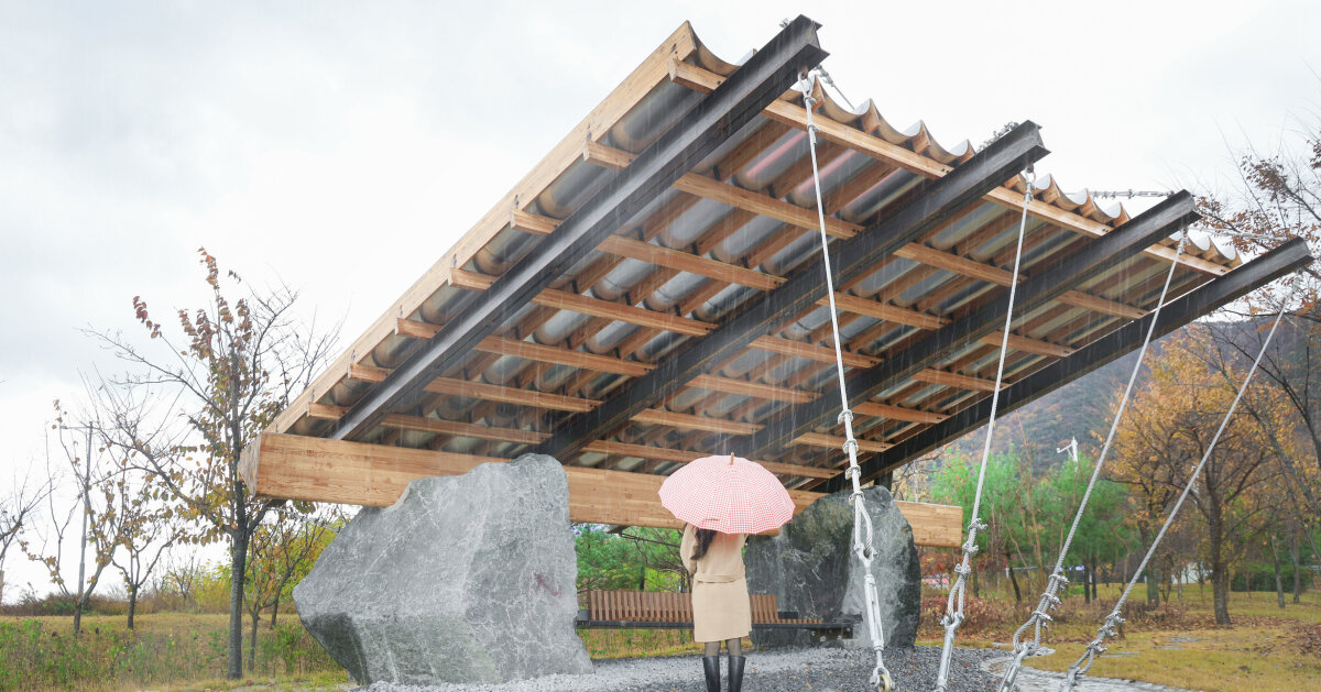 A medida que los paisajes urbanos continúan extendiéndose y el Antropoceno cambia la forma en que habitamos el planeta, la arquitectura está trabajando para redefinir el ámbito público. estudio ¿Entonces? SUPRA es permanente Instalar En Daegu, Corea del Surresolvió este desafío para la Bienal Internacional de Suseong, integrando elementos naturales y espacios públicos con sencillez poética. Su forma es casi primitiva y recuerda las tradiciones arquitectónicas coreanas. pabellón descansar madera y Metal Hay dos marquesinas encima. rocacreando un “interior urbano” donde los visitantes pueden encontrar un momento de refugio y descanso.