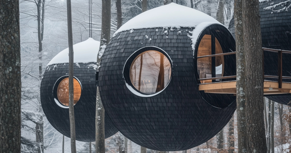 La casa en el árbol con forma de bola y tejas de madera ofrece una escapada invernal de ensueño
