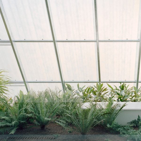 Arriba, los dormitorios y el baño se abren en altura completa, con puertas corredizas que conducen a un jardín en la azotea estilo invernadero revestido con paneles inclinados de fibra de vidrio.