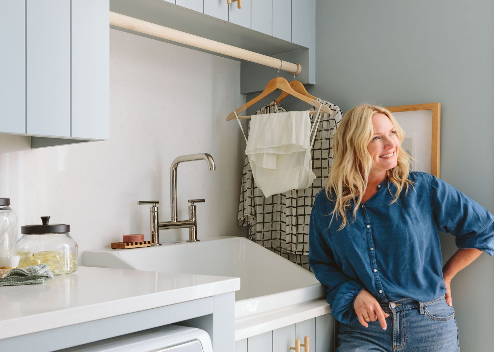 Lo diseñamos con cosas lindas en las encimeras, pero en realidad mantienen un espacio bastante claro para doblar y lavar la ropa.