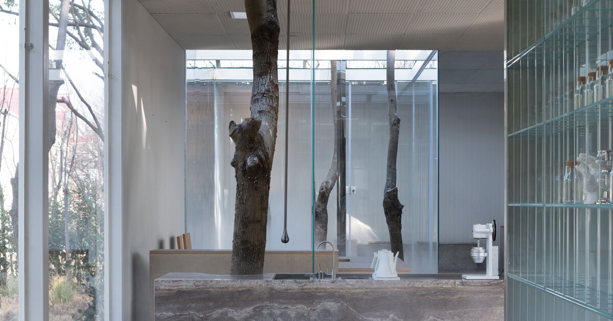 ye cafe del estudio FG de shanghai envuelve paredes de vidrio alrededor de árboles de alcanfor