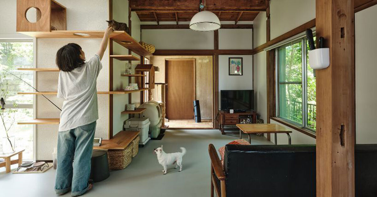 ROOVICE instala una pared de juegos para gatos en una casa japonesa de los años 70