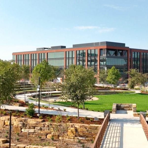 este Campus de oficina en casa Consta de más de 30 edificios, incluidos estacionamientos, tiendas, hoteles y gimnasios, repartidos en un vasto campus diseñado por arquitectos paisajistas. Grupo de aerolíneas suroeste para reflejar el entorno local de Arkansas.