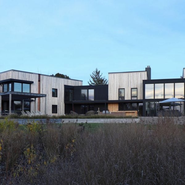La casa está envuelta en un revestimiento de cedro de tablas y listones (algunos de ellos rescatados de la estructura original) y un revestimiento negro de Shou Sugi Ban que delimita el área de transición entre la casa principal y el ala de invitados.