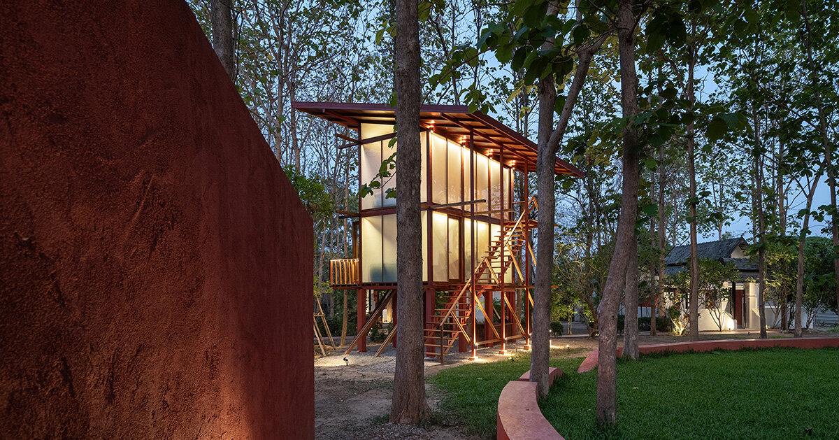 Creador de sher Cambiar el jardín de teca propiedad de la familia cabina Ingrese a la madera de viaje rojo, multifuncional retiro Se estableció una conexión de generación en Tailandia. El proyecto se encuentra en el exuberante bosque de teca, reteniendo el legado de la reparación de tranquilidad primitiva, que está relacionada con el entorno natural. Un enfoque circular rojo vibrante conecta un grupo de renovación, incluida dos renovaciones. piscina Villa, una madera reciclada pabellónRojo alto cabinaY un niño patio de juegosEsencia