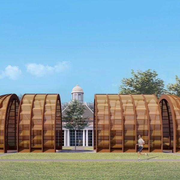 La cápsula de tiempo consistirá en cuatro módulos arqueados, que contienen estructuras de madera con paneles transparentes. Estos módulos están separados entre sí y construyen un patio con el árbol central que está alineado con el campanario de la galería.