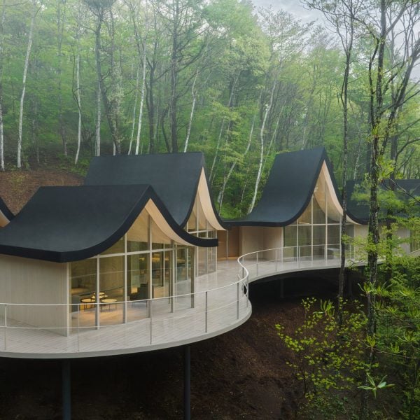 Estudio japonés Sur Crear un casa Incluyendo seis fabricación de madera cabina Conectarse a través del techo de buceo curvo KaruzawaJapón central evocó «una familia de la mano en la mano».