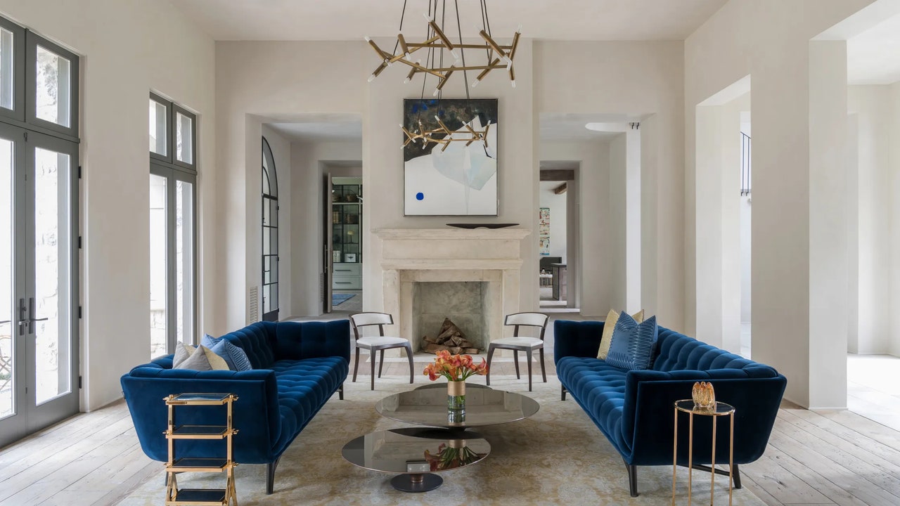 En la inyección de la paleta monocromática en la sala de estar de Houston, los colegas de Bankston pueden elegir un par de sofás de Roch Peribbes en el vibrante terciopelo azul.